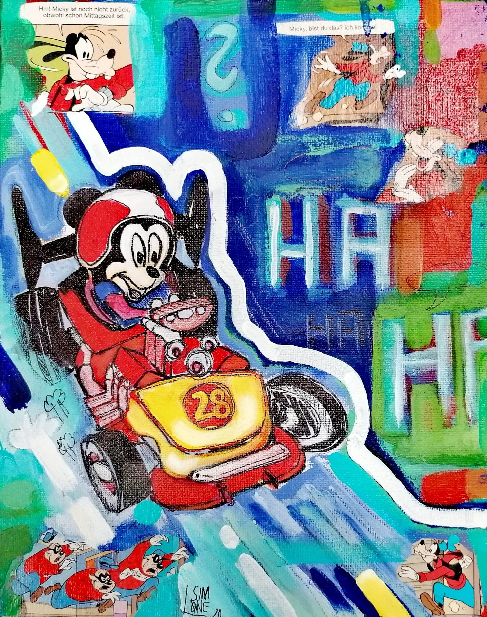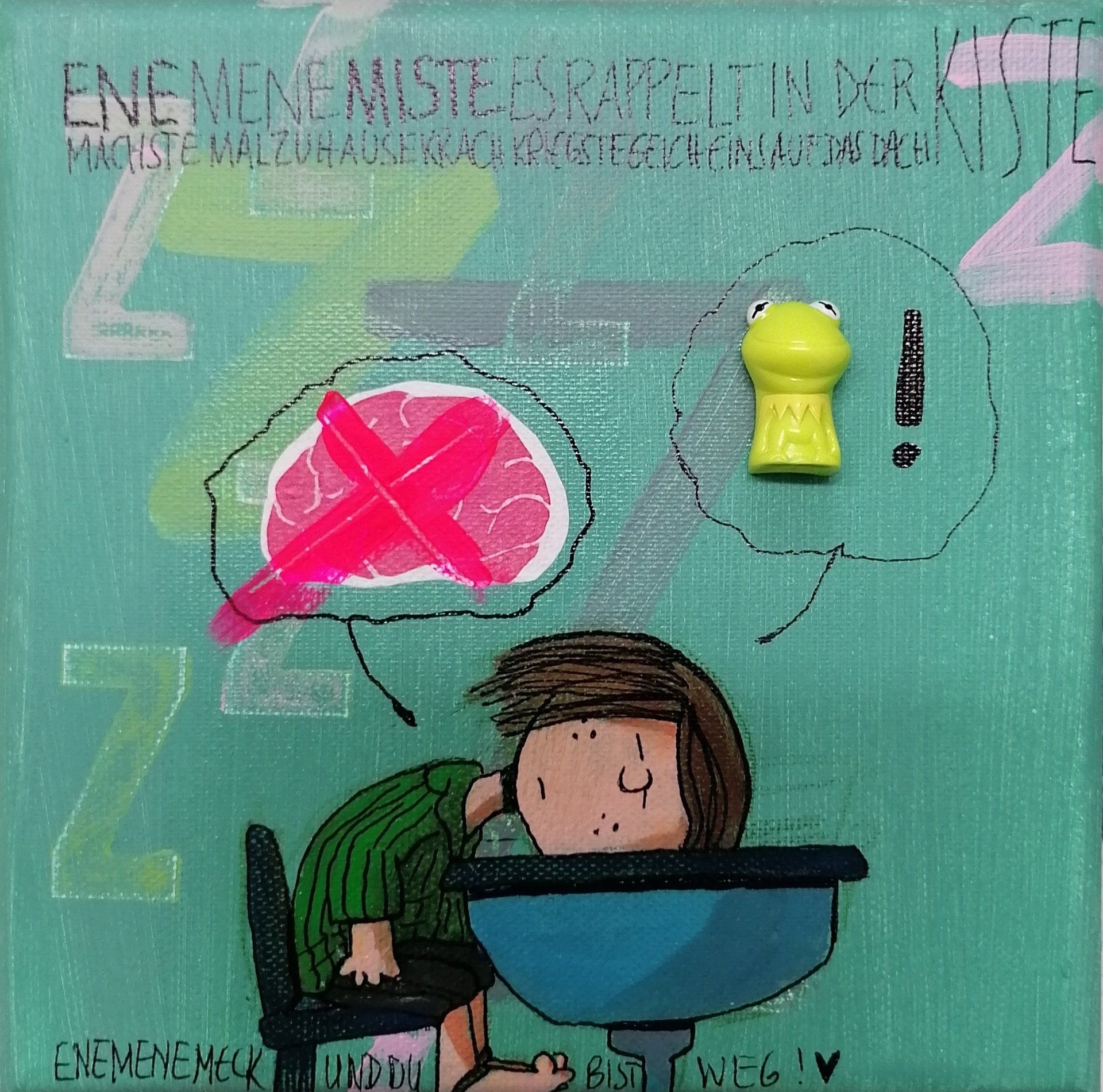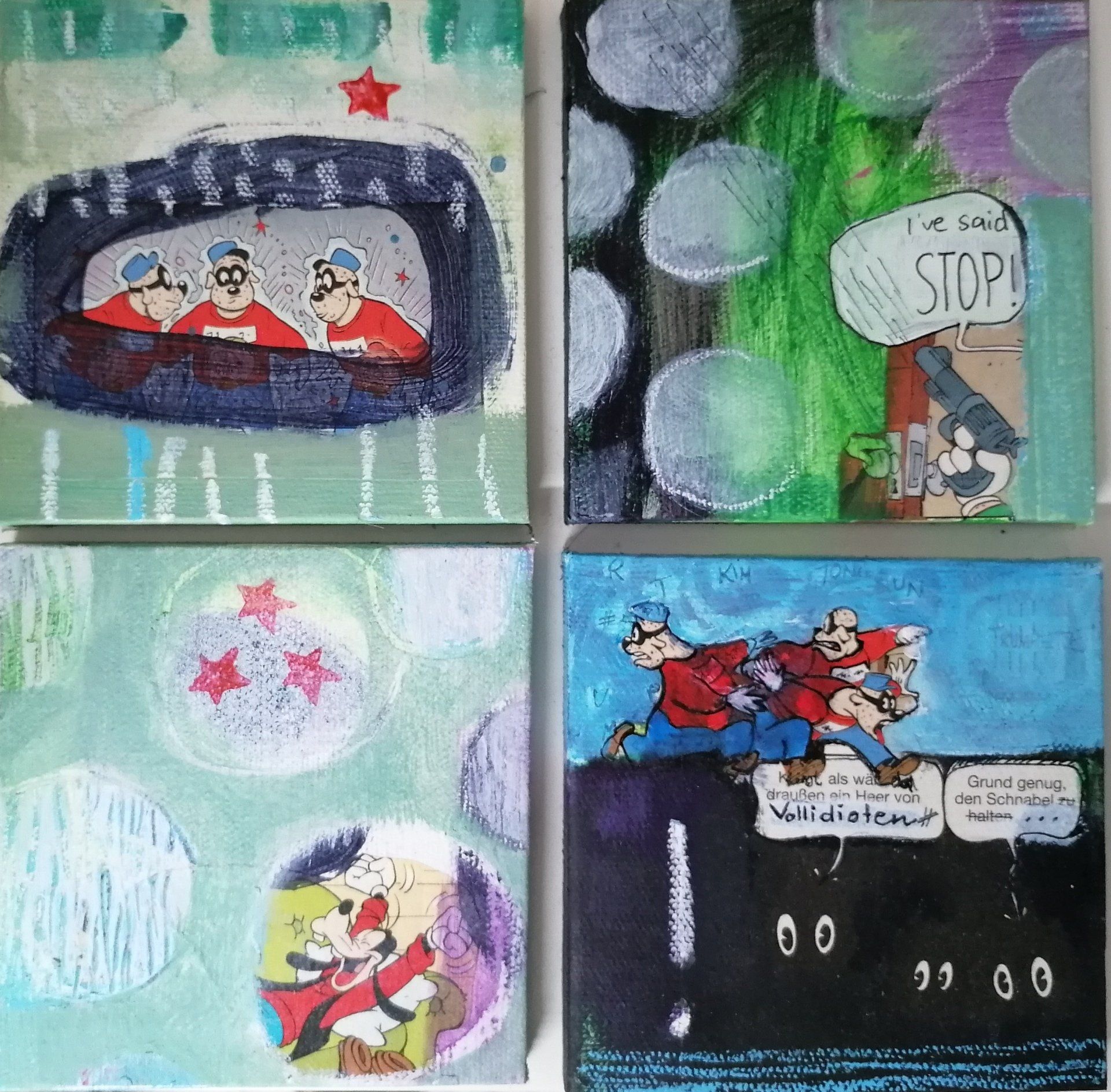Die Lektüren meiner Kindheit faszinieren mich bis heute. Mimik und Körperhaltung in trügerischen einfachen Strichen sprechen zu lassen und in die freie Malerei mit einfließen zu lassen, verbindet mich immer wieder mit meinem inneren Kind von Damals.